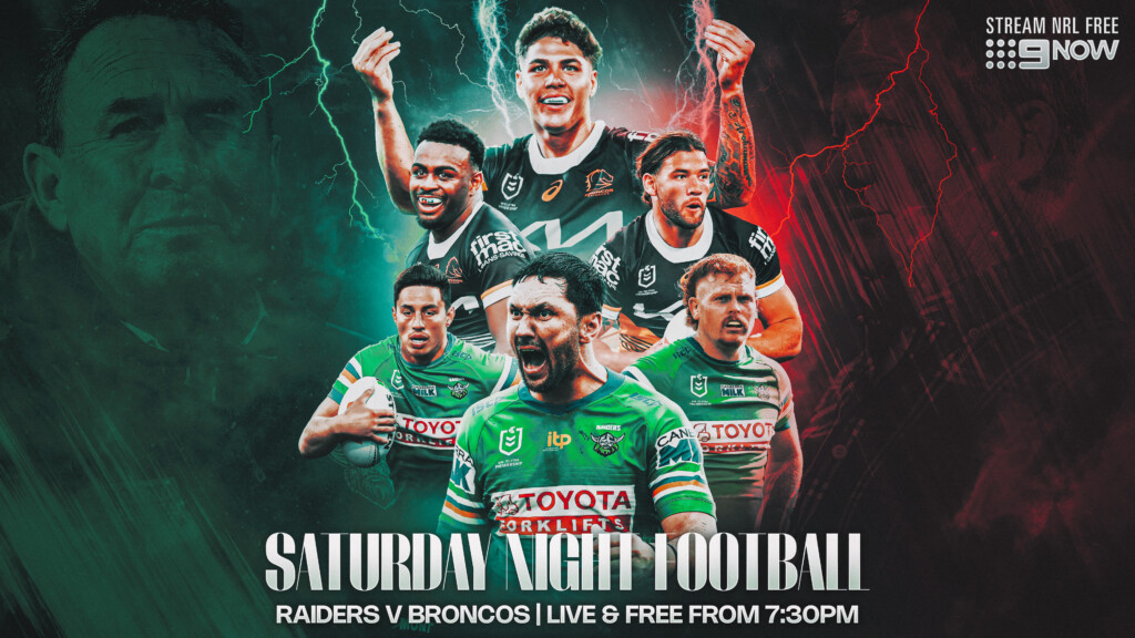 Then an NRLW triple-header begins a big day of Saturday games on Nine from 11.00am, before “Reece Lightning” Walsh and the bucking Brisbane Broncos descend on Canberra for Saturday Night Footy at 7.00pm against Ricky Stuart’s Raiders.