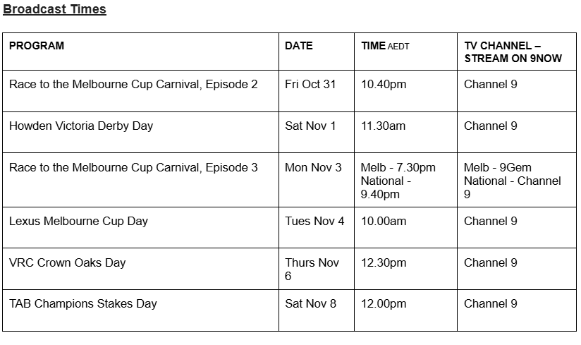 As the official broadcast partner, the 2025 Melbourne Cup Carnival gets underway with Howden Victoria Derby Day on Saturday, November 1 at 11:30am AEDT, ahead of Lexus Melbourne Cup Day on Tuesday, November 4, live and free on Channel 9 and 9Now.