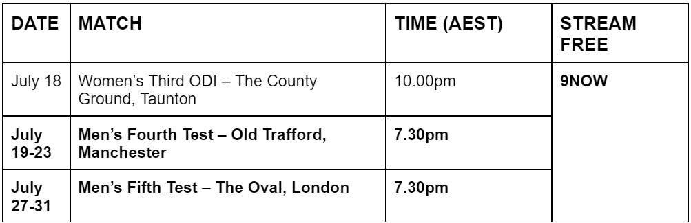 Nine’s commentary team is hosted by Roz Kelly, with expert comments from former Australian captain Mark Taylor, Ashes winner Ian Healy and former international Callum Ferguson. Taylor will be joined on the ground by Louise Ransome, with 9News reporter Sam Djodan filing from Old Trafford.