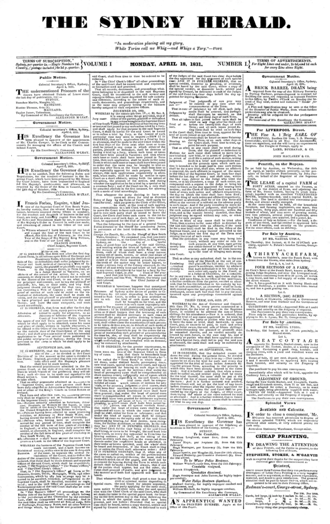 On April 18, 1831, three men – Alfred Ward Stephens, Frederick Stokes, and William McGarvie – worked in a small office off George Street in a growing colony to print 750 copies of a four-page weekly called The Sydney Herald. The first edition rolled off the presses 70 years before Federation when Australia had a population of just 70,000 and King William IV was ruling the British Empire.